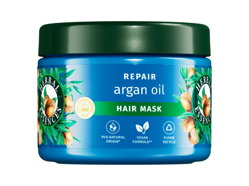 Herbal Essences obnovující maska na vlasy Repair argan oil pomáhá vyživovat velmi suché vlasy. Směs rostlinných výživných látek je obohacena o vzácný arganový olej pocházející z ručně sbíraných marockých ořechů, díky čemuž se vyznačuje veganským složením pro hloubkovou hydrataci lámavých vlasů. Složení obsahuje pečlivě vybrané složky z 94 % přírodního původu. Intenzivní vyživující maska s exotickou vůní obsahuje 3denní regenerační kúru pro přirozenou obnovu od prvního použití. Vraťte svým vlasům přirozenou krásu a potěšte své smysly díky kompletní péči s maskou na vlasy Repair argan oil od značky Herbal Essences.