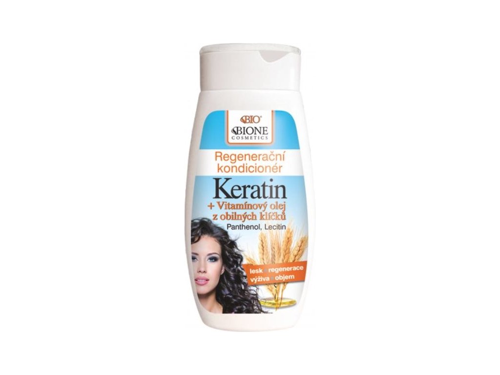 Unikátní a intenzivní regenerace všech typů vlasů. Keratinový hydrolyzát z ovčí Vlny obsahuje Aminokyseliny shodné s Aminokyselinami lidských vlasů. K unikátní maximalizaci regenerace přispívá přídavek čisté Aminokyseliny Cystein, kdy její obsah vzrůstá až na desetinásobek běžného množství v podobných výrobcích. Důsledkem je typická „sirná“ vůně přípravku. Používáním kondicionéru Keratin dochází k doplnění vlasové struktury narušené slunečním zářením, barvením, trvalou ondulací, fénováním, odbarvováním a stárnutím. Vlasy se zpevní, vrátí se jejich pružnost a lesk, netřepí se. Kondicionér je doplněn o regenerační panthenol a o rostlinný Lecithin. Regenerace a výživa Vašich vlasů je podpořena kličkovým olejem s vitamíny B1, B2, B6 aj. Po aplikaci prostředku dochází ke zvětšení objemu účesu a ke zvýšení lesku vlasů. Vykazuje vysokou rozčesávatelnost vlasů, zvětšuje jejich objem. Obsah lahvičky vystačí až na 100 použití!