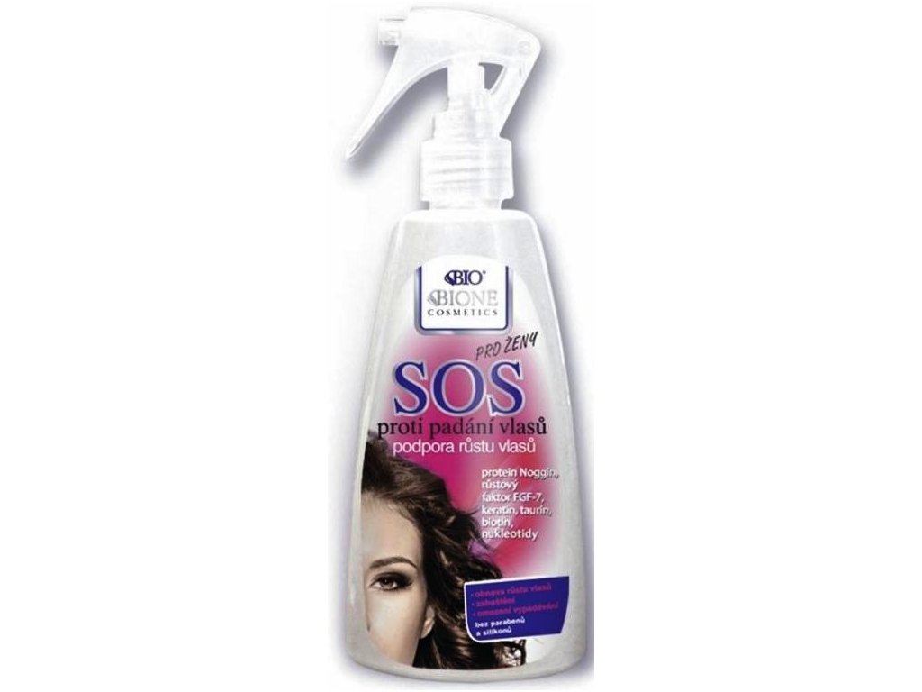Záchranný SOS sprej unikátně a komplexně spojuje účinné látky chránící vlasy před předčasným vypadáváním, zároveň podporuje zrychlený růst vlasů nových. Na hlavě tak zůstávají i ty vlasy, které by již jinak vypadly, k nim zrychleně přirůstají nové a vlasový porost se tak výrazně zahustí. SOS změkčuje vlasovou pokožku a usnadňuje zásobování vlasového pletence živinami. Růstový faktor FGF−7 podporuje syntézu vlasové bílkoviny, jeho úroveň vzrůstá až o 50 %! Dochází k rozvoji vlasových Folikulů, k obnově syntézy vlasového Barviva. Noggin spolu s taurinem potlačují účinek faktoru TGF−beta, který je zodpovědný za přirozené zpomalení růstu vlasů. Kombinace nukleotidů adenosinu, guanosinu, thymidinu a uridinu je známým prostředkem omlazení pokožky, její hydratace a podpory růstu ochlupení. Přípravek obsahuje řadu „signálních“ molekul a výživných složek – Cystein, inositol, arginin, fruktózu, panthenol, tyrosin, Niacinamid, Biotin, MSM, Aminokyseliny získané hydrolýzou lískových ořechů a keratinový hydrolyzát. Po 3měsíčním používání až 95 % uživatelů prokazuje významné snížení vypadávání vlasů, až 85 % uživatelů prokazuje opětovný růst vlasů nových, všichni uživatelé uvádějí výrazné zlepšení vlasové kvality.