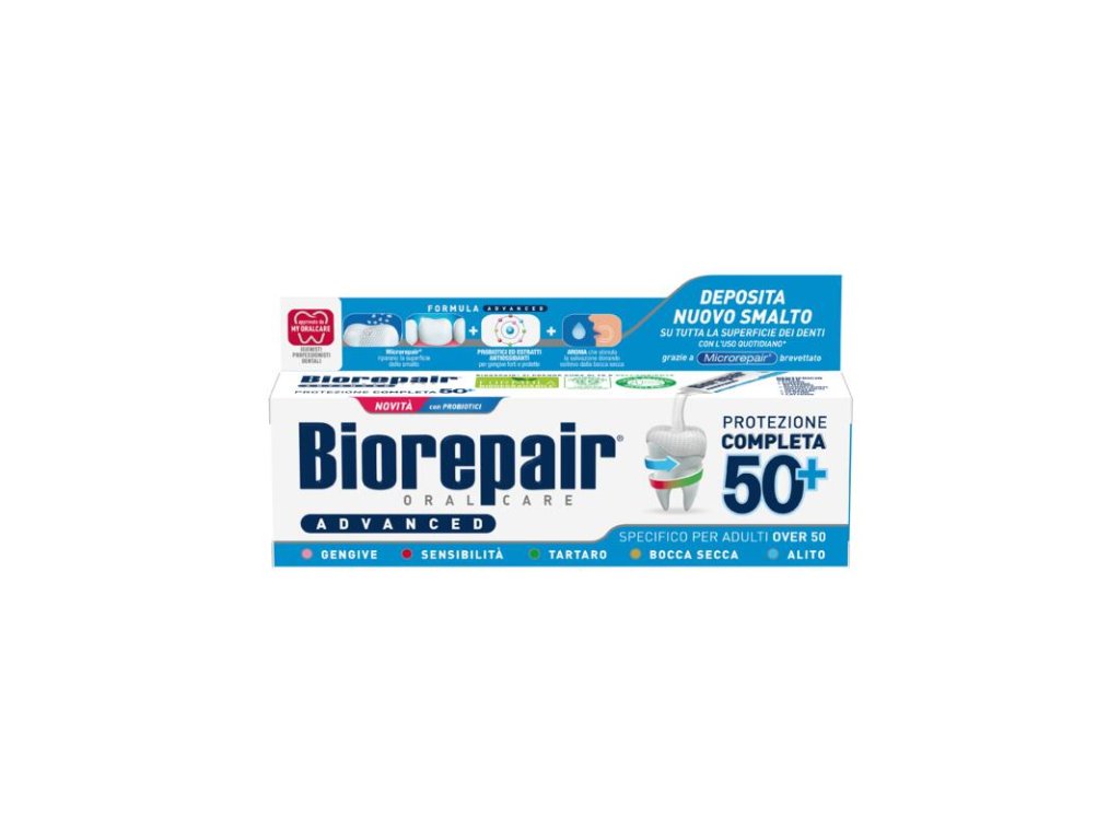 Kompletní péče o ústní dutinu pro dospělé nad 50 let Inovativní zubní pasta s technologií Microrepair® pro obnovu zubní skloviny*. Obsahuje probiotika, laktoferin a kyselinu hyaluronovou pro zdravé dásně a ústní sliznici. Uzavírá dentinové kanálky, čímž snižuje citlivost zubů, a účinně bojuje proti zubnímu kameni i suchu v ústech. Zajišťuje dlouhotrvající svěží dech. Vlastnosti: Opravuje a posiluje zubní sklovinu* (Microrepair®) Snižuje citlivost zubů Bojuje proti plaku a zubnímu kameni Posiluje dásně a zklidňuje sliznici Zmírňuje sucho v ústech a osvěžuje dech Bez fluoridů, SLS, parabeny, oxidu titaničitého, lepku a laktózy Pasta poskytuje komplexní péči zaměřenou na pět hlavních problémů zralé ústní dutiny: citlivé zuby, oslabené dásně, tvorbu zubního kamene, sucho v ústech a zápach z úst. *In vitro test. Opravný účinek Microrepair® vztahující se k pokrytí mikrotrhlin na povrchu skloviny (ne kazivých lézí nebo odštípnutých zubů). Použití: Používejte jako běžnou zubní pastu. Použití je díky absenci fluoridu povoleno i pro děti do 6 let, bez dozoru dospělé osoby.Допълнителни параметри