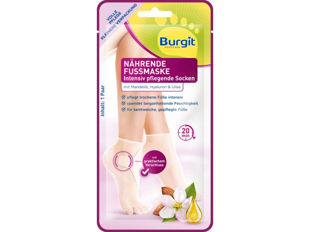 Výživná maska na nohy Chtěli byste malou přestávku? S výživnou maskou na nohy od Burgitu si můžete v budoucnu užívat lázeňské chvíle doma. Jednorázové ponožky dodávají pokožce výživné složky jako je urea, kyselina hyaluronová a mandlový olej a poskytují bohatou hydrataci. Výsledkem jsou znatelně hladší a pružnější chodidla již po první aplikaci. Pro zdravý vzhled vašich nohou. Jednorázové ponožky s maskou na nohy. S kyselinou hyaluronovou, ureou a mandlovým olejem. Intenzivně hydratuje. Dělá nohy hladké a pružné. Pohodlná a snadná aplikace. Použití: Umyjte a osušte nohy. Vyjměte ponožky z obalu a nasaďte si je. Odlepte papír ze spony a obtočte jej kolem kotníku pro lepší držení a přilepte na místo. Nechte působit 20 minut. Zbytek masky vmasírujte dle libosti. Není nutné mytí.Допълнителни параметри