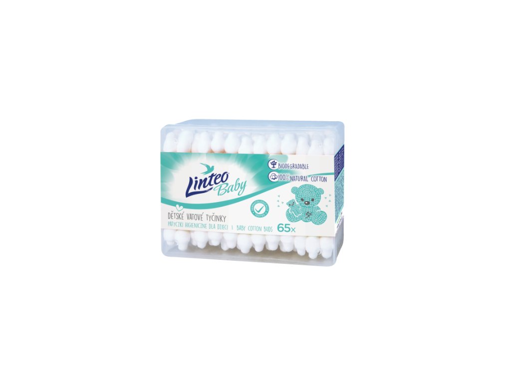 Vatové tyčinky Linteo Baby jsou speciálně navrženy pro dětská ouška. Díky pevnému návinu jsou i pro nejmenší děti bezpečná. Jedno balení obsahuje 65 ks vatových tyčinek, které jsou uložené v praktickém boxu.