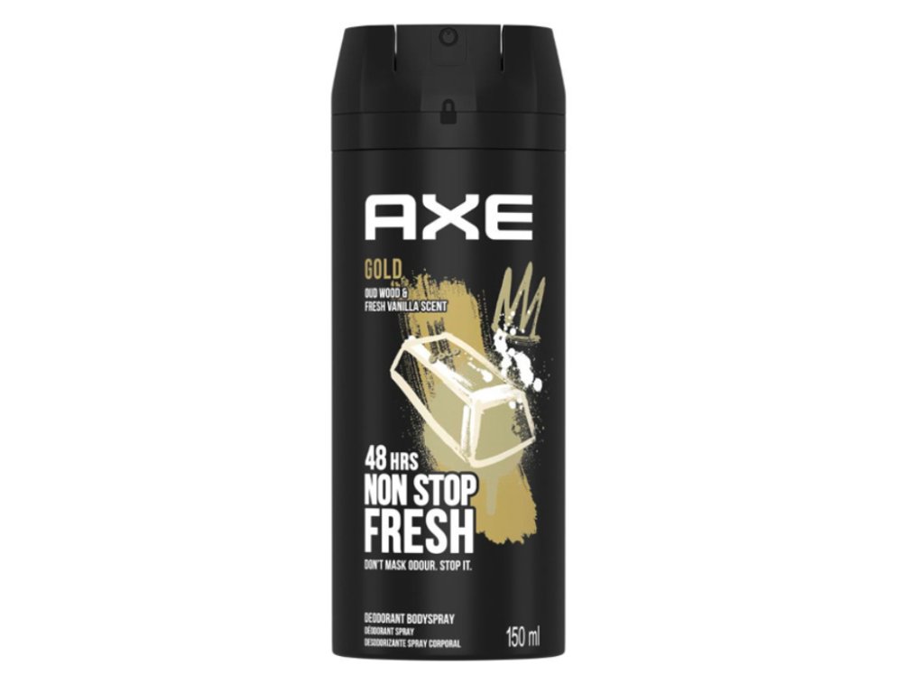 Pánský antiperspirant AXE Gold ve spreji. Spolehlivá a dlouhotrvající ochrana proti pocení až 72 hodin. Brání vzniku bílých a žlutých skvrn na oblečení. Jemná vůně s tóny dřeva bohů a Vanilky. Chrání Tvůj styl. Každý den. Spolehlivě. AXE Gold Antiperspirant poskytuje dlouhotrvající ochranu proti pocení, na kterou se může každý muž spolehnout. Díky speciálnímu složení pomáhá zabraňovat vzniku žlutých skvrn a bílých stop na oblečení. Bílá košile nebo černé triko - ať je Tvůj styl jakýkoli, AXE Gold nechá vyniknout Tvojí jedinečnost. Bez koláčů v podpaží a skvrn, které ničí oblečení. Používej ráno do podpaží pro celodenní ochranu proti potu.