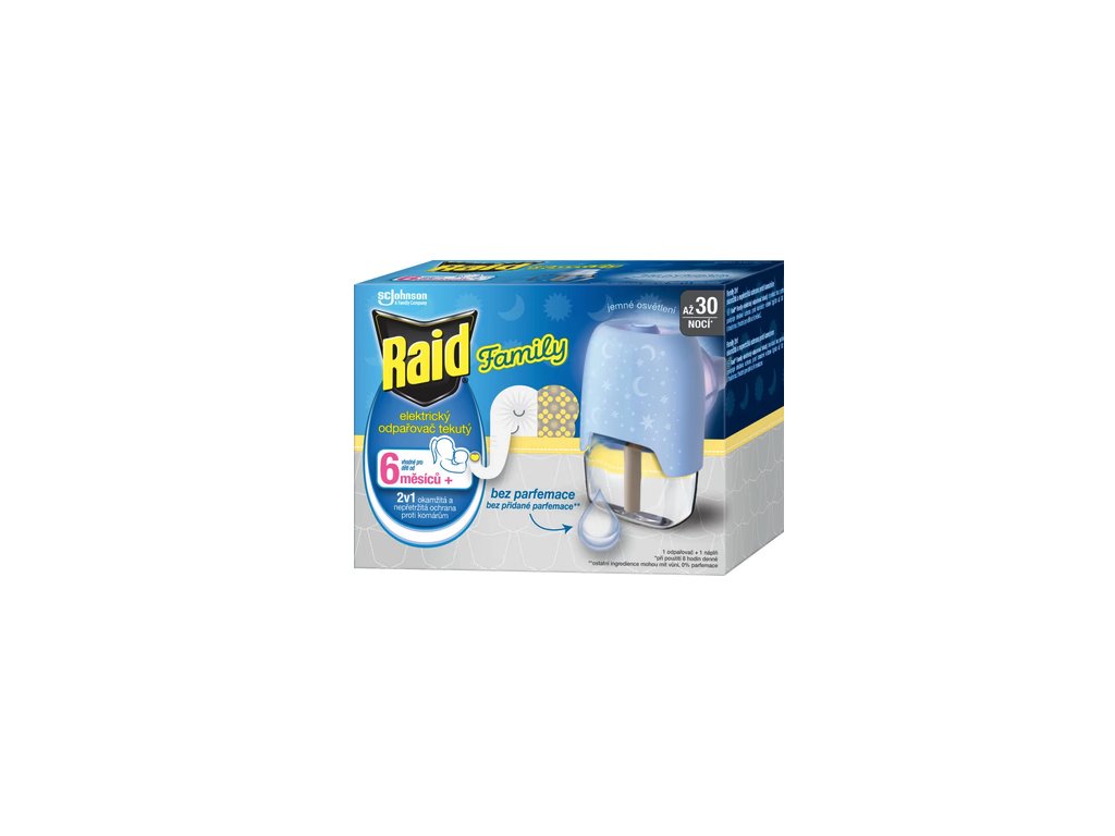Raid elektrický odpařovač s tekutou náplní, insekticidní přípravek bez parfemace pro domácí použití. S novým štíhlým designem odpařovače a kontrolkou signalizace provozu. Poskytuje účinnou ochranu, působí rychle proti komárům a ostatnímu drobnému létajícímu hmyzu i při mírně otevřených oknech a rozsvícených světlech až po odbu 30nocí, při používání 8 hodin/noc. Ochrání místnost do 30 m3. Lze použít do předešlých Raid odpařovačů. Další upozornění a návod pro použití je uvnitř obalu.