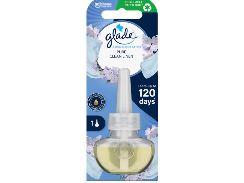 Příjemná vůně prádla usušeného letním sluncem naplní vzduch svěží vůní čistoty. Náhradní náplň do elektrického osvěžovače vzduchu Glade Electric Scented Oil. Tato náhradní náplň provoní váš domov či kancelář a tím pro vás vytvoří příjemnou atmosféru. Při nízkém nastavení intenzity a denním nastavení 12 hodin denně na odpařovači každá náplň poskytne až 100 dní vůně.