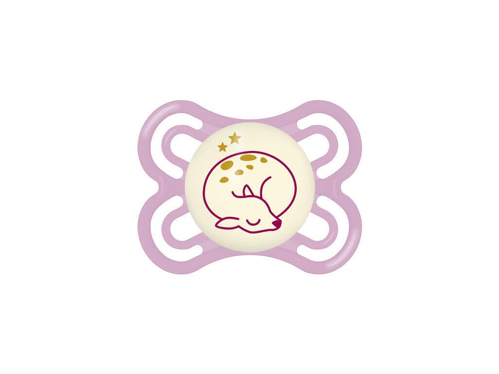 Ortodontický dudlík pro miminka od narození Ortodontický dudlík MAM Perfect Night 0+ snižuje riziko křivého růstu zoubků a vadného skusu. Dudlíky MAM Perfect Night jsou speciálně vyvinuty pro noční použití – knoflík dudlíku ve tmě svítí, takže ho rodiče i děti mohou snadno nalézt i v noci. Díky jedinečné sametové savičce Dento-Flex je krček dudlíku o 60 % tenčí a čtyřikrát měkčí (v průměru o 32 – 83 % tenčí a 1,1 – 19krát měkčí než u běžných silikonových dudlíků). Zoubky tak získají větší prostor pro svůj růst a riziko zkřivení zoubků se tak sníží. S průměrem pouhých 2,8 mm je krček savičky MAM Perfect nejtenčím, který je dostupný na trhu (testováno výzkumným institutem v Rakousku na 27 dudlících z celého světa). 94 % miminek přijímá silikonovou savičku MAM SkinSoft™, která je jemná jako dětská pokožka (průzkum trhu 2010–2019, testováno 1 463 dětmi v 6 zemích) Dudlík je šetrný k dětské pokožce díky velkým větracím otvorům v límci dudlíku, které umožňují lepší proudění vzduchu kolem úst, a tím pomáhají zmenšit podráždění pokožky způsobené zachycováním slin. Díky knoflíku lze dudlík snadno a rychle uchopit a rovněž jednoduše připevnit k pásku. Baleno v praktickém boxu, který udržuje dudlík v čistotě a zároveň slouží pro jeho sterilizaci. Všechny produkty MAM jsou vyrobeny z materiálů neobsahujících BPA a BPS.Допълнителни параметри