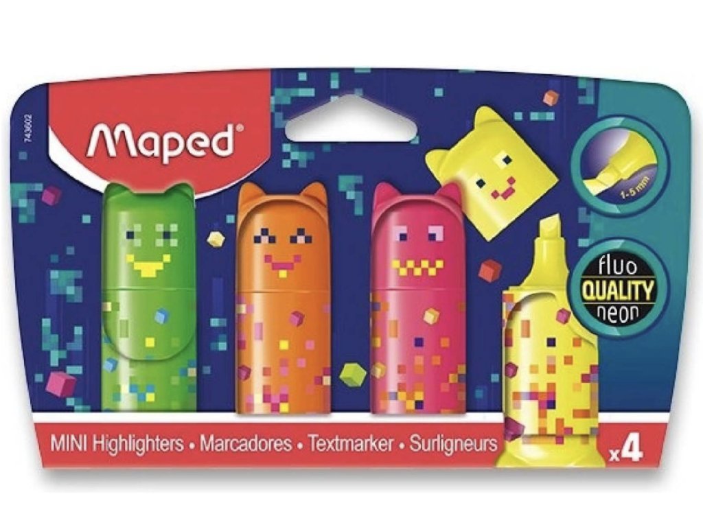 Plochý mini zvýrazňovač Maped Pixel Party Mini v zářivých barvách. Atraktivní design inspirovaný herními kódy Pixel. Víčko a tělo v barvě inkoustu. Kvalitní a jasný fluorescenční inkoust. Ideální velikost pro školní penál. Odolný proti vysychání a vyblednutí.