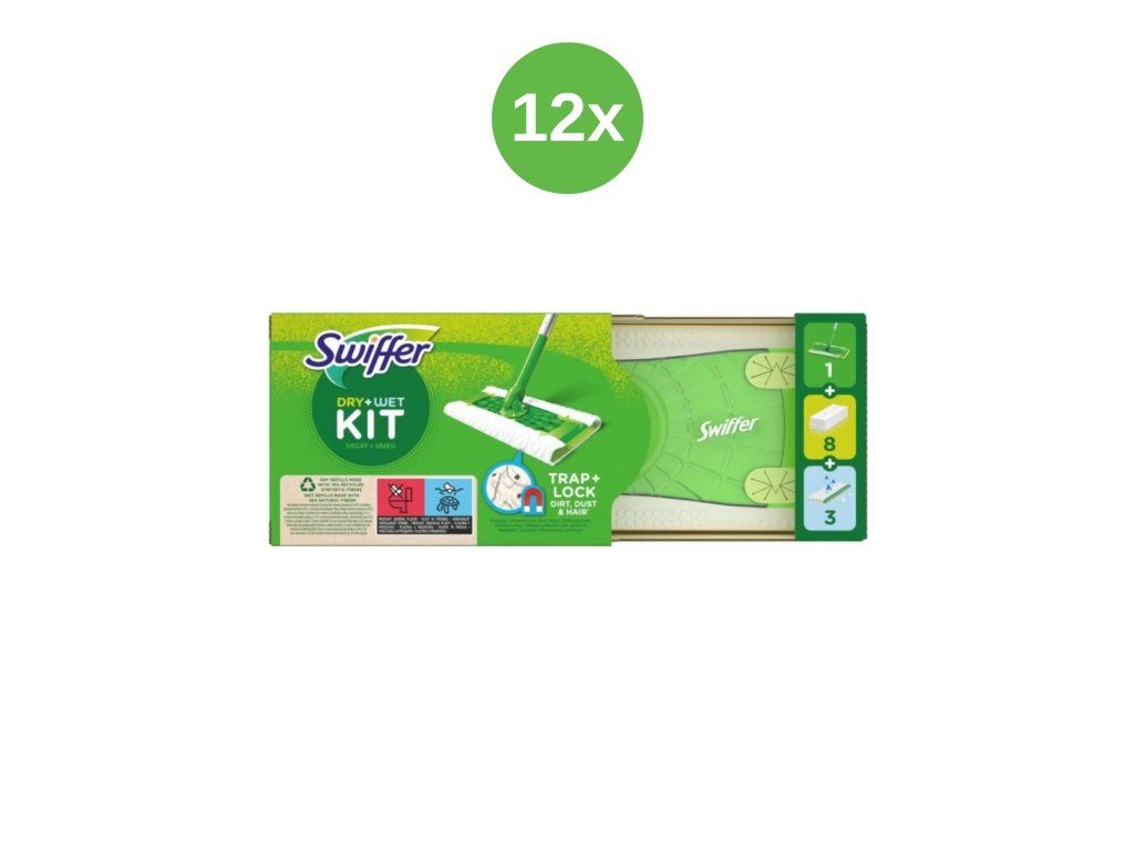 Комплектът Swiffer е идеалният избор за бързо, удобно и ефективно почистване без усилие. Благодарение на комбинацията от сухи и влажни кърпи, той може да се справи както с обичайните замърсявания, така и с по-щателно почистване в една стъпка.