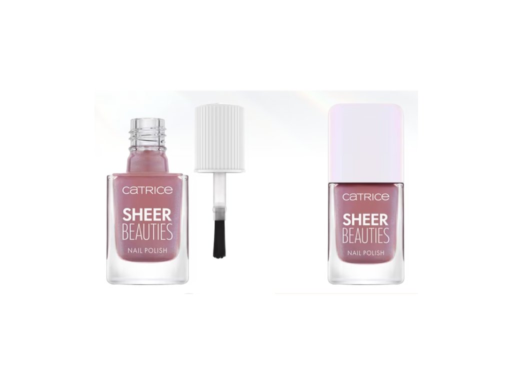 CATRICE Lak na nehty Sheer Beauties v jemných tělových odstínech funguje jako filtr na nehty. Nehty jsou viditelně rozjasněny namodralým třpytem a jemně průhledný efekt umožňuje přirozené barvě nehtů prosvítat.