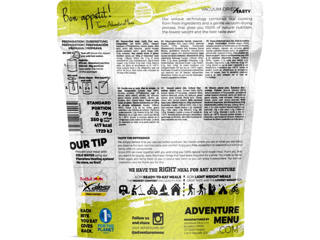 Приготвянето на ястието е много лесно, просто залейте сухата смес с вода и я загрейте. Можете лесно да се справите с целия процес дори на най-високите планински върхове. Бързо ще си възстановите необходимата енергия и можете да се впуснете с ентусиазъм в следващото си приключение. Той е идеален за зимни пътеки, например, когато надеждно ще ви стопли в студено време. Благодарение на състава си, готовият Dhal е подходящ и за вегани и хора, които избягват глутен или лактоза.