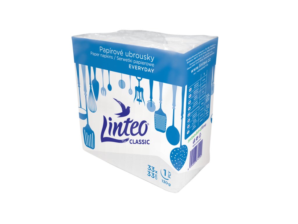 Linteo 1vrstvé bílé papírové ubrousky o rozměru 33 x 33 cm.