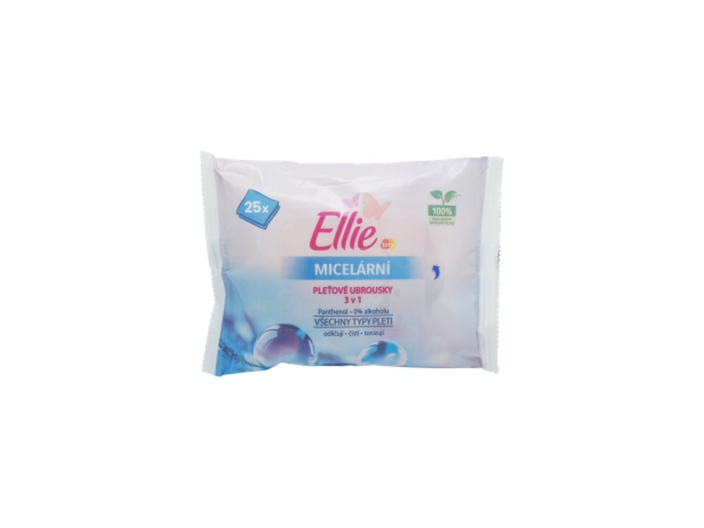 Micelární pleťové ubrousky Ellie čistí, odstraňují make-up a rozjasňují pleť. Jsou speciálně určené pro čištění a odličování obličeje a očí bez použití vody. Díky obsahu jemných micel a panthenolu pleť účinně čistí a zanechávají příjemný a svěží pocit. Ubrousky jsou zcela rozložitelné a šetrné k životnímu prostředí. Bez obsahu alkoholu. Dermatologicky testováno.