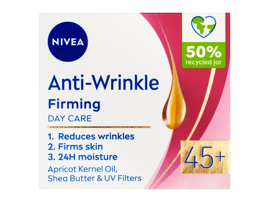Коя жена не би искала стегната кожа за цял живот? Правилната грижа може да направи чудеса! Потърсете интензивната формула с UV филтри , масло от ший и масло от кайсиеви ядки . Вашата награда ще бъде видимо по-стегната кожа, която също така ще бъде защитена от образуването на нови бръчки, причинени от UV лъчите. Доверете се на доказаната грижа за по-стегната и гладка кожа - NIVEA Firming Anti-Wrinkle Day Cream 45+ .