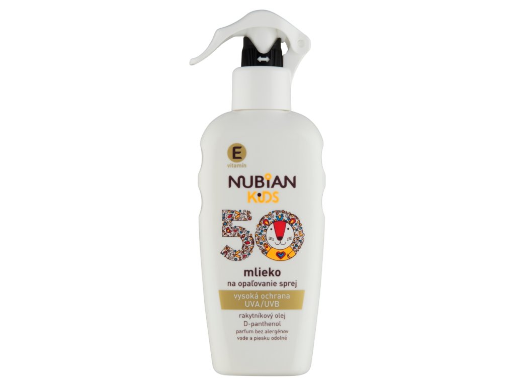 Dětská pokožka je citlivá a na sluníčku velmi zranitelná. Chraňte ji dětským sprejem na opalování Nubian Kids s vysokým stupněm ochrany SPF 50. Díky rakytníkovému oleji a vitaminu E se dětská pokožka během slunění regeneruje a D-panthenol ji zklidňuje. Nubian Kids mléko na opalování SPF 50 ve spreji je citlivě parfémované bez obsahu alergenů a odolné vůči vodě. Krém v jemné vrstvě rovnoměrně nastříkejte na suchou dětskou pokožku těla i obličeje 15 minut před sluněním. Vyhýbejte se oblasti kolem očí. Nanášení během dne pravidelně opakujte, zejména při nadměrném pocení či po plavání. Vyvarujte se nadměrného slunečního záření kolem poledne (11–15 h) a chraňte se oblečením, pokrývkou hlavy a slunečními brýlemi. Děti do tří let nevystavujte přímému slunečnímu záření. Nadměrné slunění vážně ohrožuje zdraví. Žádný opalovací přípravek neposkytuje 100% ochranu před slunečním zářením. Opalovací prostředek může zanechat kontaktní skvrny na textiliích a jiných materiálech.