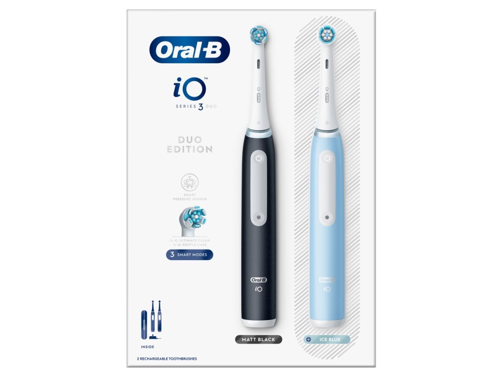 Четката за зъби Oral-B Series 3 се откроява не само с резултатите, видими още от първия ден, но и с тихата си работа и максимална лекота на грижа за зъбите ви. Съдържание на пакета: 2× iO3 дръжка, черна + синя 2× глава за четка 1× калъф за пътуване 1× зарядно устройство