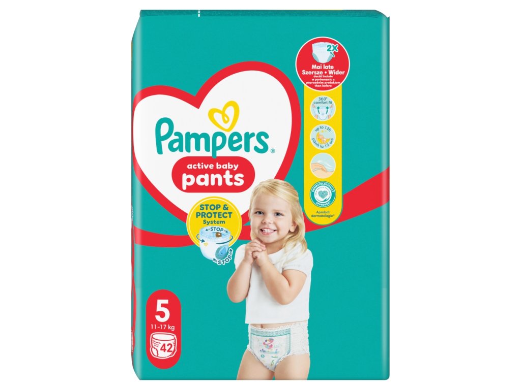 Plenkové kalhotky Pampers Pants pro jednoduchou výměnu během dne, Snadno se oblékají jedním tahem, Snadno se svlékají roztrhnutím na bocích, Pásek pro snadnou likvidaci plenky, Plenkové kalhotky Pampers Pants jsou pohodlné v každém směru a poskytují ochranu proti protečení po celou noc, Pružný pas po celém obvodu, který se přizpůsobuje bříšku vašeho děťátka, Super absorpční jádro, které rychle odvádí vlhkost, Dvojité manžetky pomohou předcházet protečení kolem nožiček