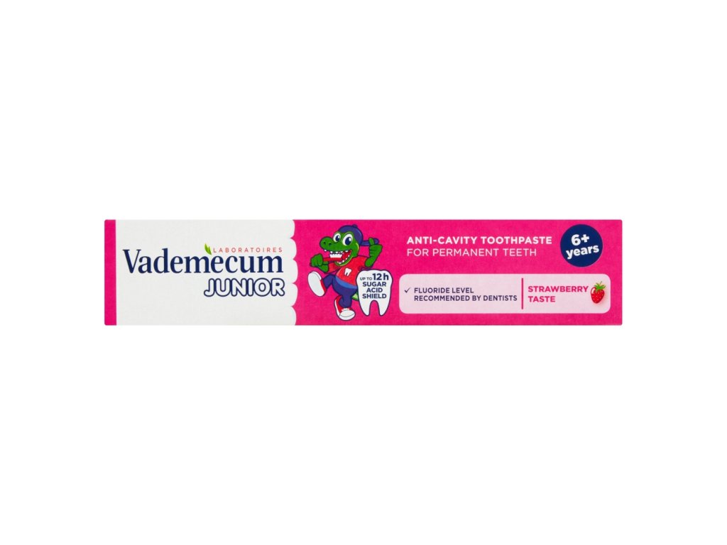 Díky lákavým příchutím Vademecum Junior budou vaše děti čištění zubů milovat. Vademecum Junior zubní pasta obsahuje odpovídající úroveň fluoridu doporučenou zubními lékaři - 500 ppm pro děti do 6 let. Receptura navíc obsahuje tekutou formu vápníku (kalcium-glycerofosfát), jehož ionty hrají důležitou roli v kombinaci s fluoridem v remineralizačním procesu zubů.