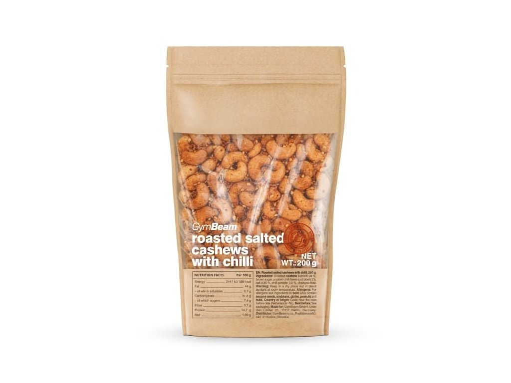 Печените солени кашу с чили внасят ново измерение в света на солените лакомства. Основната роля играят висококачествените, хрупкави печени ядки кашу , които съставляват 94% от опаковката. Техният естествено маслен и леко сладък вкус е перфектно балансиран от гурме смес от подправки . Съдържа счукани люспи чили (известни като Pul Biber), класически чили на прах, сол и изненадващо докосване на кафява захар , което приятно завършва пикантността.