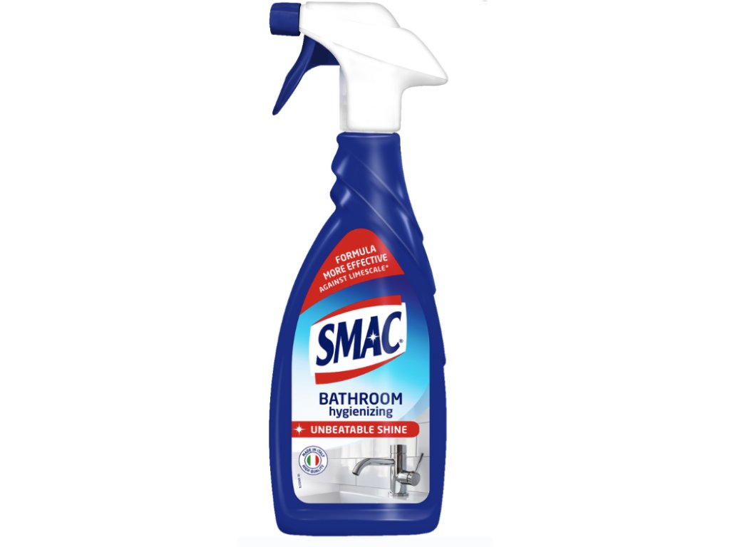 SMAC Koupelna – odstraňuje lehce nečistoty a odolné vápenaté usazeniny ze všech povrchů v koupelně. Složení s antibakteriálním účinkem důkladně čistí a snadno se oplachuje. Povrchy jsou čisté a lesklé po dlouhou dobu.