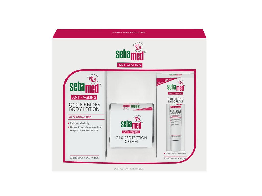 Balíček pro krásnou a zdravou pleť sebamed péče proti vráskám je obohacena o pokožce přirozený koenzym Q10, který aktivuje produkci kožních buněk a navrací tak pokožce její pružnost a hladkost. Hodnota pH 5,5 navíc posiluje přirozený ochranný plášť kůže. Při pravidelném používání chrání proti předčasnému stárnutí kůže. Balíček obsahuje tyto tři produkty: sebamed Anti-Age krém proti vráskám s Q10 Viditelně méně vrásek již po 28 dnech Pečující komplex s Q10, panthenolem a vitaminem E vyhlazuje pokožku a zlepšuje její elasticitu sebamed Anti-Age zpevňující tělové mléko s Q10 Zlepšuje elasticitu kůže a intenzivně ji hydratuje Rychle se vstřebává sebamed Anti-Age liftingový oční krém s Q10 Prokazatelně redukuje vrásky okolo očí Aktivní komplex s rostlinnými peptidy poskytuje intenzivní hydrataci Vyhlazuje, vyživuje, chráníДопълнителни параметри