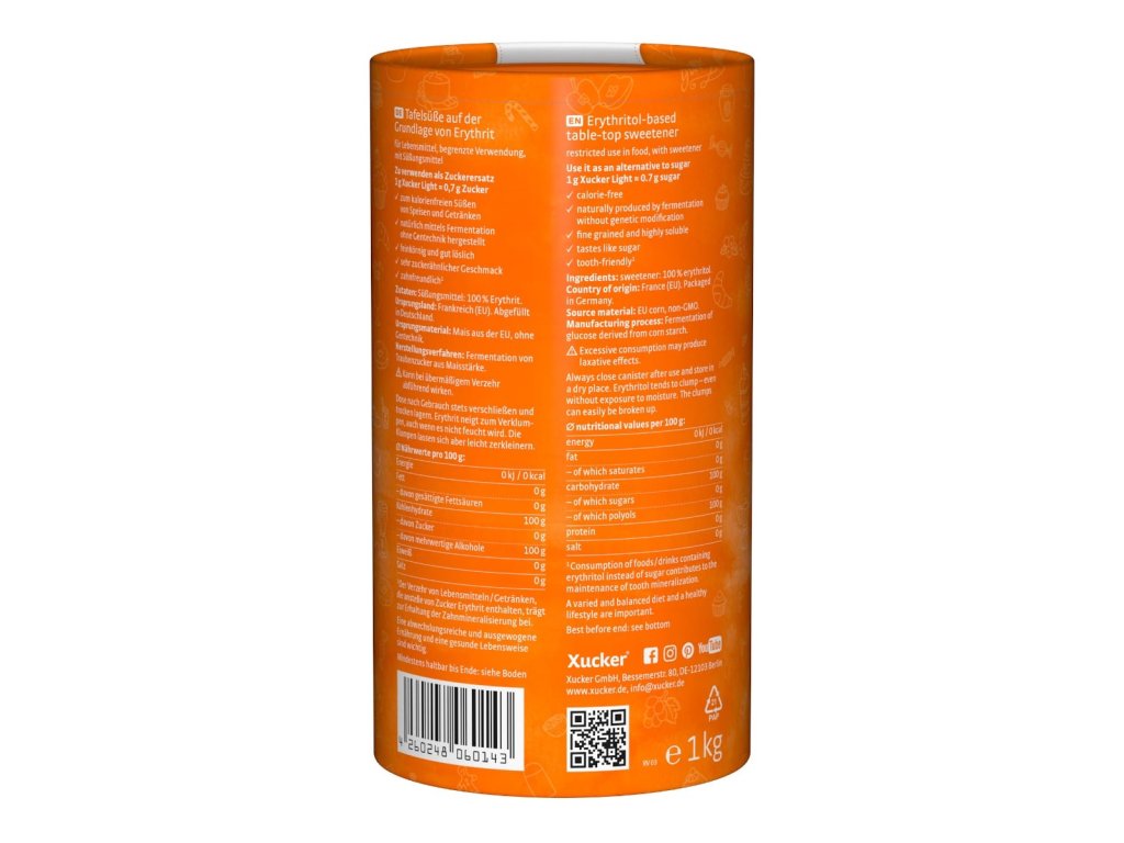 Подсладителят Erythritol Light е заместител на захарта, произведен чрез ферментация на глюкоза от царевично нишесте. Той е отлична алтернатива на обикновената захар, дори я наподобява, но не съдържа калории. Сладостта му е приблизително 70% от сладостта на обикновената и тръстиковата захар. Продуктът е веган и е опакован в практичен и многократно затварящ се контейнер.