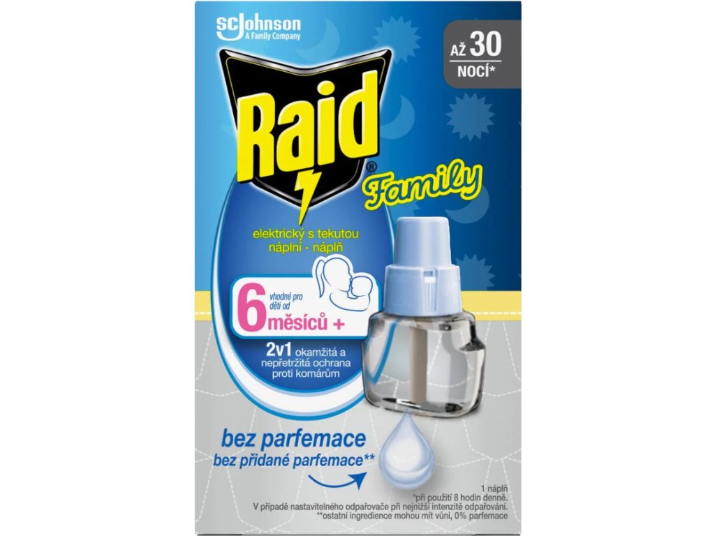 Raid elektrický odpařovač s tekutou náplní, insekticidní přípravek bez parfemace pro domácí použití. S novým štíhlým designem odpařovače a kontrolkou signalizace provozu. Poskytuje účinnou ochranu, působí rychle proti komárům a ostatnímu drobnému létajícímu hmyzu i při mírně otevřených oknech a rozsvícených světlech až po dobu 30 nocí, při používání 8 hodin/noc. Ochrání místnost do 30 m3. Lze použít do předešlých Raid odpařovačů. Další upozornění a návod pro použití je uvnitř obalu.