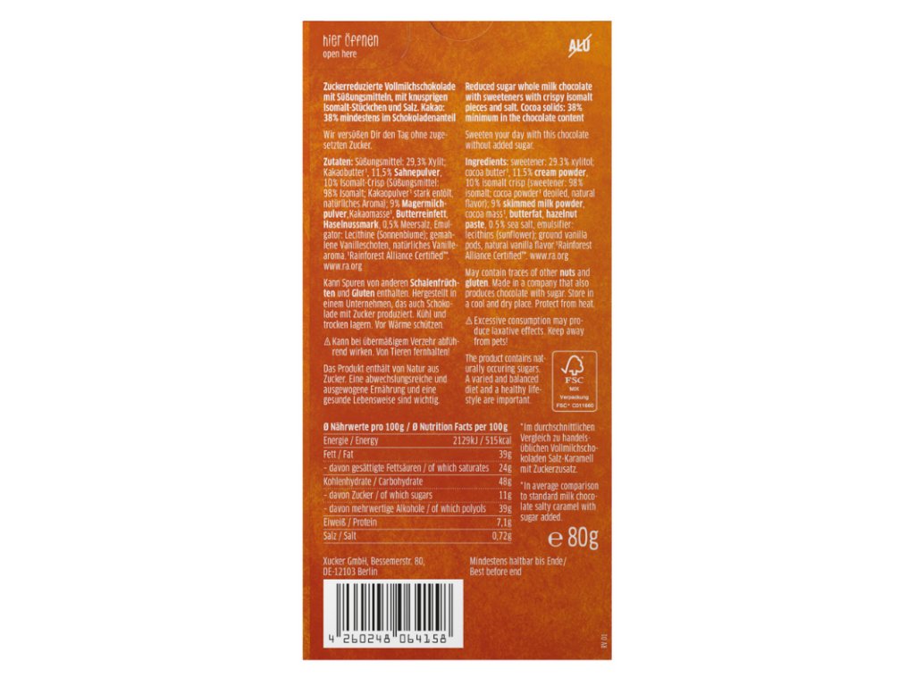 Шоколад с вкус на солен карамел без палмово масло , който ще ви спечели с уникалния си вкус. Меката текстура на шоколада е доминирана от подсладителя ксилитол. Напротив, в него няма да откриете и следа от баластни добавки, ГМО или соя. Нещо повече, вместо алуминиева пластмаса, той е обвит в компостируемо естествено фолио. Така че не се колебайте и се насладете на истинския вкус на шоколад!