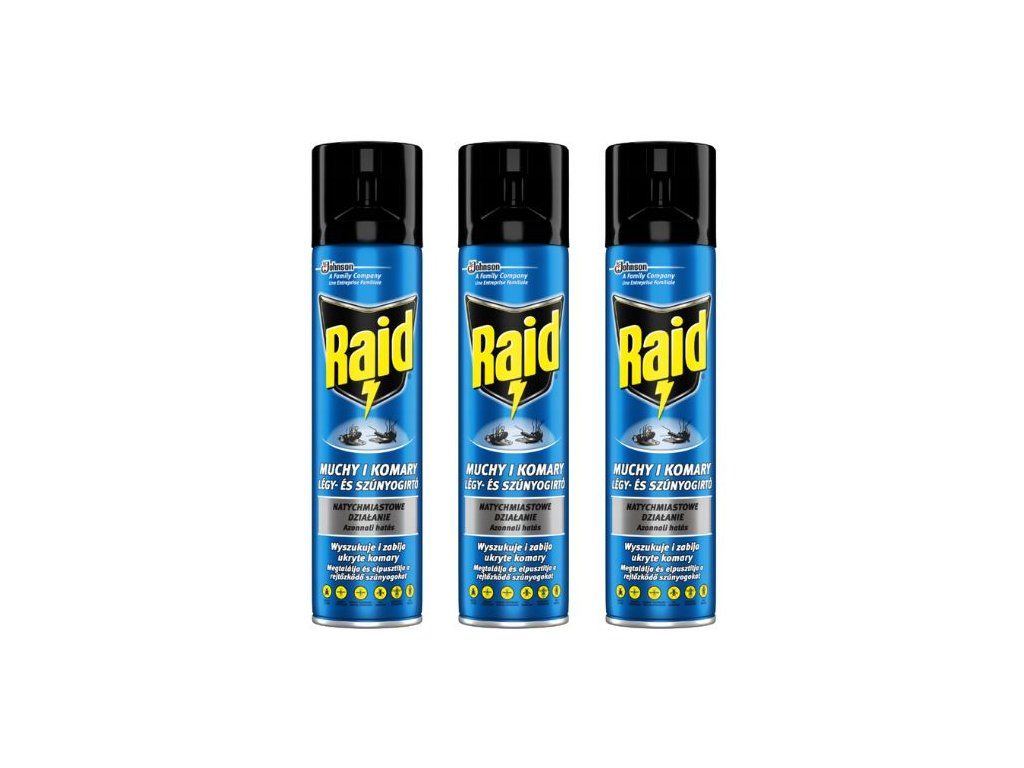 Аерозолът Raid срещу летящи насекоми е ефективен инсектициден спрей, предназначен за бързо унищожаване на комари, мухи, оси, стършели, молци и други досадни насекоми. Благодарение на специалния си състав, той действа веднага след нанасяне и може да се използва както на закрито, така и на открито.